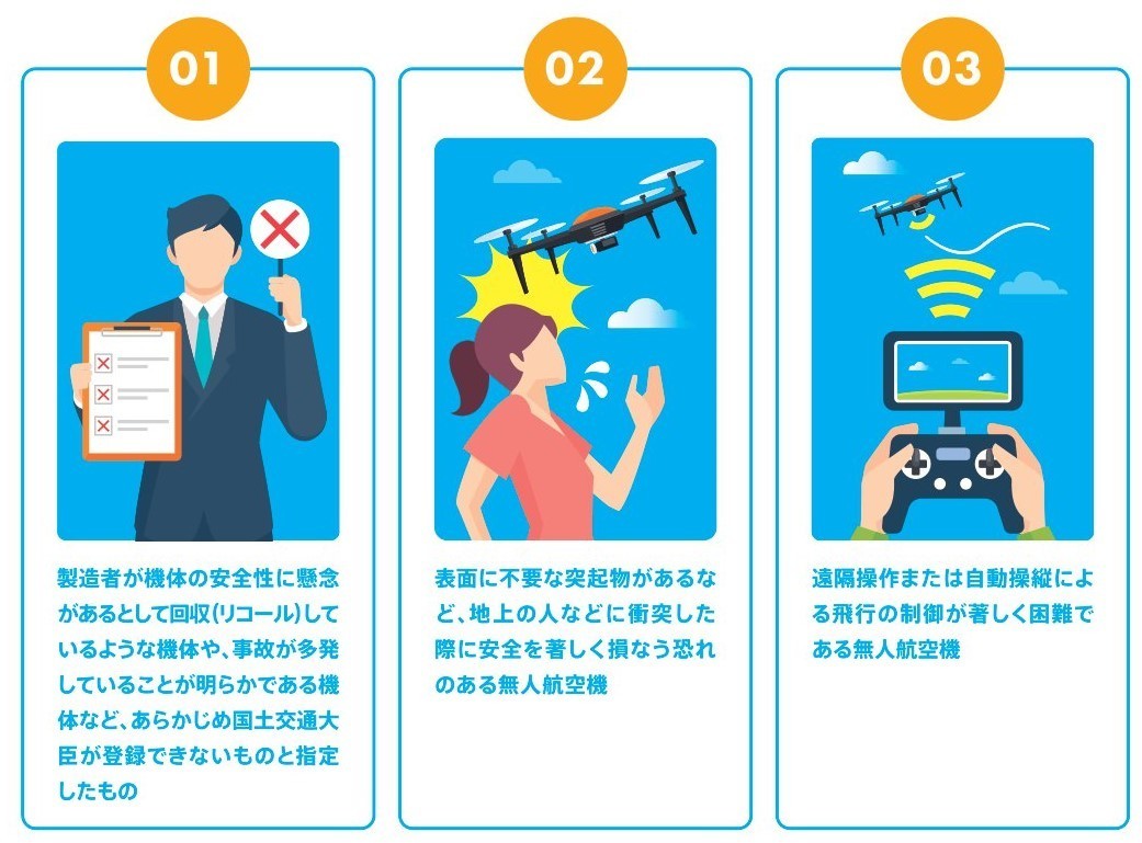 最低限必要となる機体の安全性を確保するため、以下の要件に該当する場合は登録することができません。