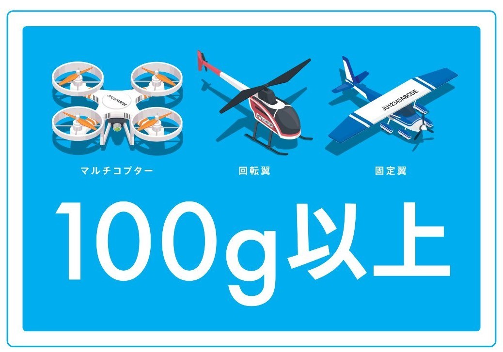 無人航空機に当てはまらないものを、従来の『重量が200g未満のもの』から『重量が100g未満のもの』へ改められました。これによって、100g以上のすべての無人航空機が登録の対象になります。