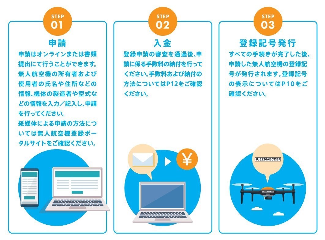 無人航空機の登録にあたっては、以下の図のとおり、3つのステップを行う必要が有ります。