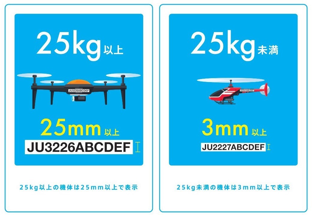 25kg以上の機体は25mm以上、25kg未満の機体は3mm以上の文字の高さでマジックやシールなどで表示してください。